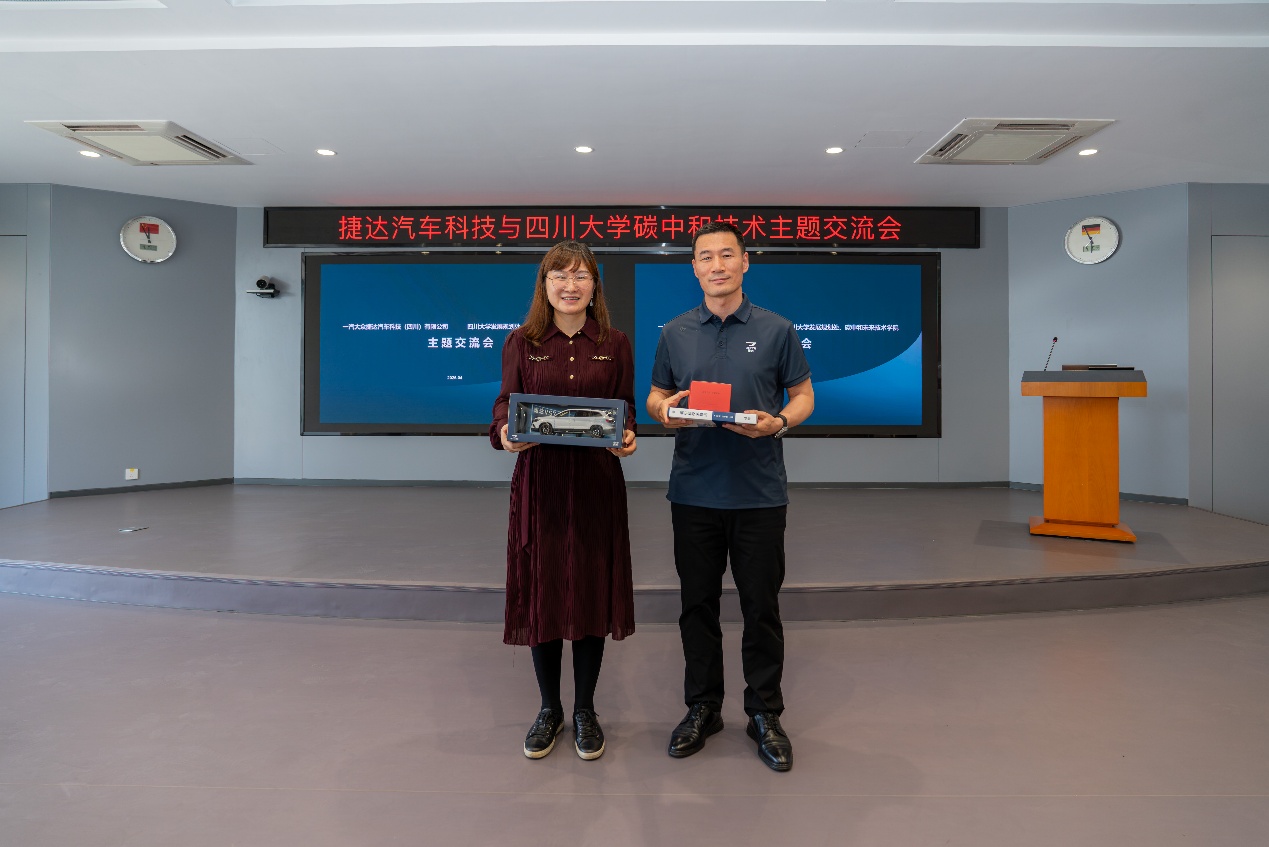 总结环节,学院党总支书记、常务副院长江霞教授表示,学院将发挥学科与科研优势,为捷达科技绿色转型提供智力与技术支撑,助力企业提升低碳核心竞争力,服务地方汽车产业高质量发展。捷达科技高启政副总经理指出,此次交流会为校企合作奠定坚实基础,捷达科技将以交流为契机,深化与川大碳中和学院协同,加快低碳技术应用与创新,以实际行动践行“双碳”使命,推动汽车产业绿色可持续发展。