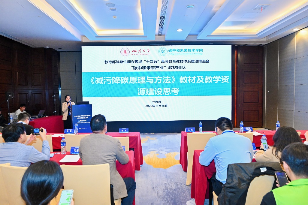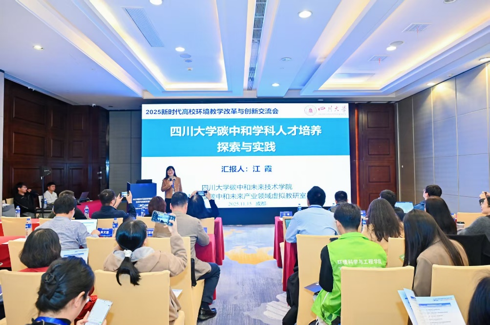 2025年11月15日,四川大学碳中和未来技术学院(后简称“学院”)承办的“碳中和新兴领域课程建设与人才培养”研讨会成功召开。此次会议是由教育部高等学校环境科学与工程类专业教学指导委员会与高等教育出版社联合主办的“2025新时代高校环境教学改革与创新交流会”的分会场。研讨会由教指委委员、湘潭大学葛飞教授和学院常务副院长江霞教授共同主持,昆明理工大学李凯教授、学院碳中和技术教研室主任周力副研究员担任助理主持。